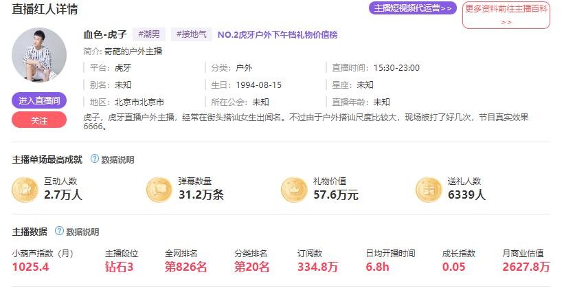 小葫芦数据统计,虎牙各大主播商业估值。在石排名娱乐版块第一位,商业估价一个亿!