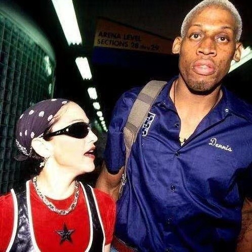 不得不说,罗德曼在当时的火爆性格,十分受那个年代女明星的喜欢。美国著名流行女王麦当娜,就是罗德曼的迷妹之一。在当时,很多女星都喜欢到现场观看NBA比赛,而作为麦当娜这样级别的明星,肯定能够出现在公牛比赛的场边。当时的迈克尔乔丹如日中天,然而麦当娜却被“一头彩色头发”的丹尼斯-罗德曼吸引了眼球。