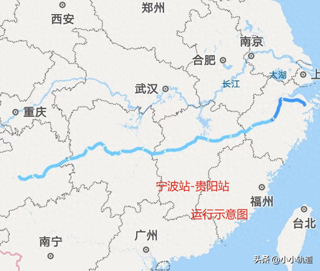 列车10:56从宁波站出发,次日14:34到达终点站贵阳站,中间一共停靠17个站点(详情见表)。全程1743公里,运行时长为27小时52分钟。列车由成都局贵阳客运段担当,25G型客车。