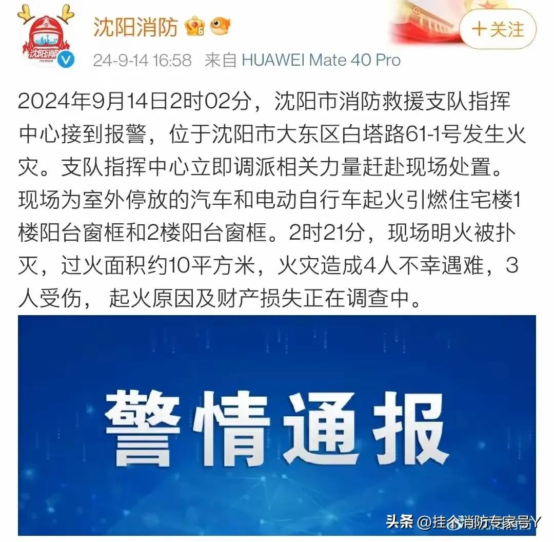 #火灾有多可怕#9月13日晚间,沈阳市大东区大北街道一居民楼发生火灾,事故已造成4死3伤。