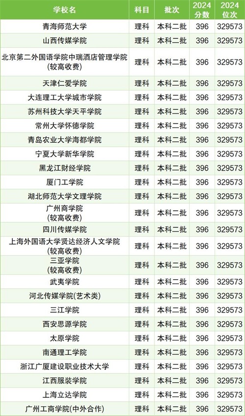 以理科二本线为例,该分数位次排名327849名~329573名对应的学校有:青海师范大学、山西传媒学院、天津仁爱学院、北京第二外国语学院中瑞酒店管理学院(较高收费)、大连理工大学城市学院、苏州科技大学天平学院等。