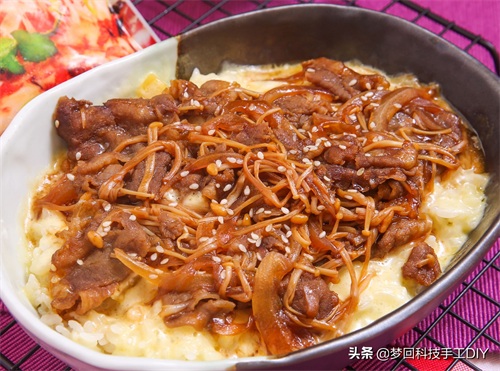 3、汤汁滗在锅里,这时加入100ml的水、柴鱼精、姜泥、洋葱丝盖上盖子煮5分钟、中间翻炒一下、火不要开的太大,要留下3分之一的汤汁浇在饭上,最后把肉片倒入和洋葱混合拌均即可;