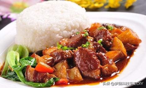 下洋葱、西红柿、芹菜炒至汤汁浓缩(不要收太干哦),最后加调料调味,土豆丁盖浇饭制作完成。