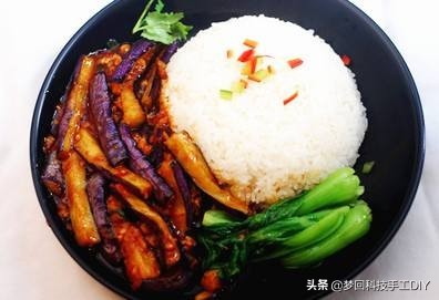 3、倒入炸好的茄子拌炒一下,在倒入碗中调好芡汁拌炒入味,浇在米饭上即可。