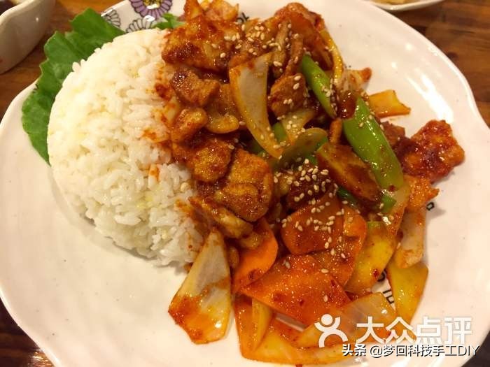 3、放上一层黄瓜,挤上沙拉酱;放上一层生菜,挤上沙拉酱;最后放一层炸鸡小块,挤上沙拉酱;日式炸鸡盖浇饭完成。