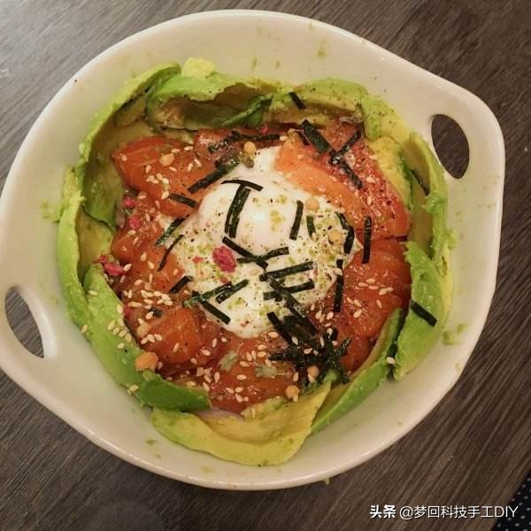 三文鱼肉刺身用)、青葱、姜、海盐、味精、蜂蜜芥未、胡椒、酱油、牛油果、米饭。