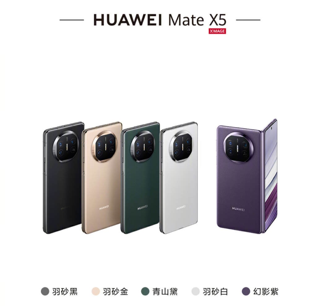 华为Mate X5重量约为245g,搭载麒麟9000S 5G处理器,7.85英寸OLED内屏和6.4英寸OLED外屏,内、外屏皆120Hz屏幕刷新率,支持LTPO自适应刷新率,1440Hz高频PWM调光,全链路10.7亿色彩显示,外屏覆盖昆仑玻璃。华为Mate X5配有羽砂黑、羽砂白、羽砂金、青山黛、幻影紫5种颜色,创新双旋水滴铰链设计,自研XMAGE影像技术,支持双向北斗卫星消息,支持IPX8级防水,系统搭载HarmonyOS 4。