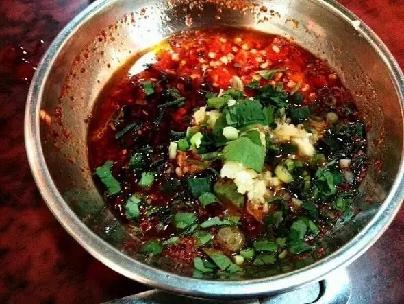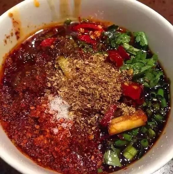 辣油+辣椒粉+麻椒粉+小米椒+香菜+葱花