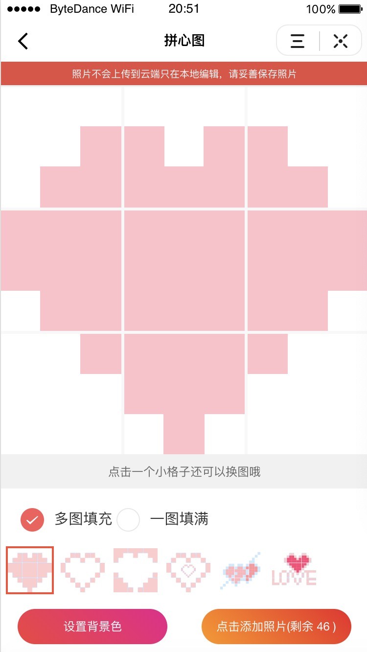 进到拼心图, 点击添加图片。 选择你要的图片。