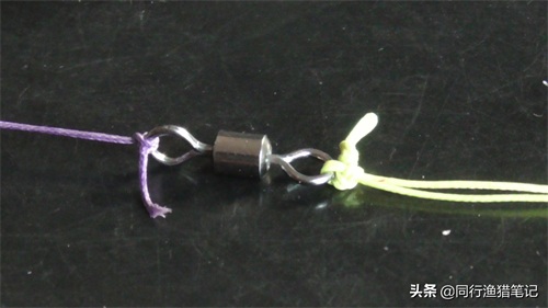给8字环绑子线。先将子线打好结并将结头穿入8字环孔。将结头围绕双子线缠绕一至二周后从线圈孔穿出,往后拉紧双子线,子线就锁定在8字环上了。