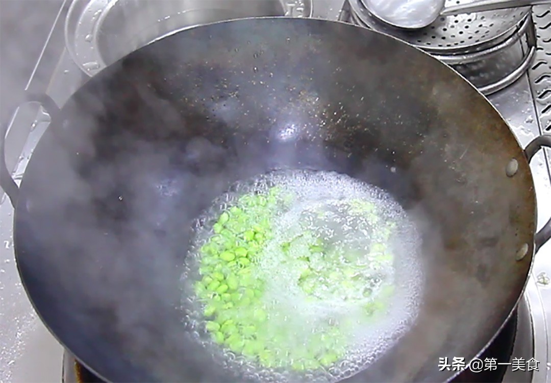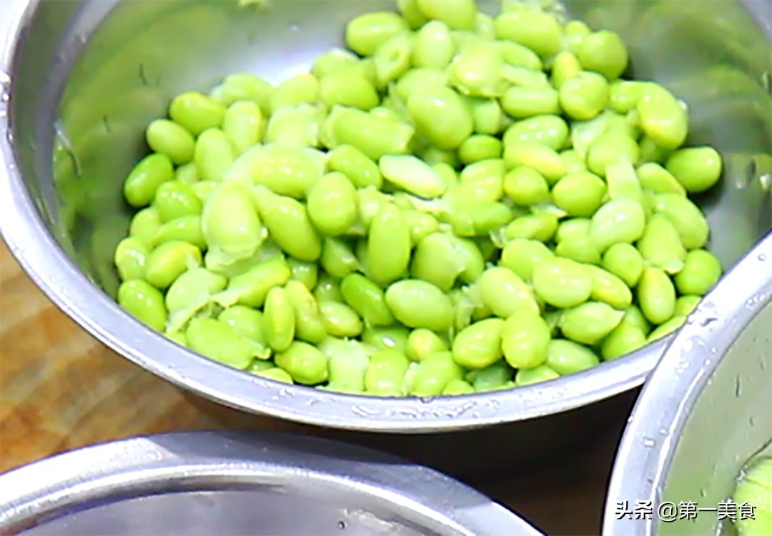 锅内烧水,放入毛豆,焯水片刻捞出水面上的豆皮和浮末,毛豆焯熟以后捞出来,快速用凉水冲一下备用,凉水冲洗毛豆吃起来口感更嫩还脆。