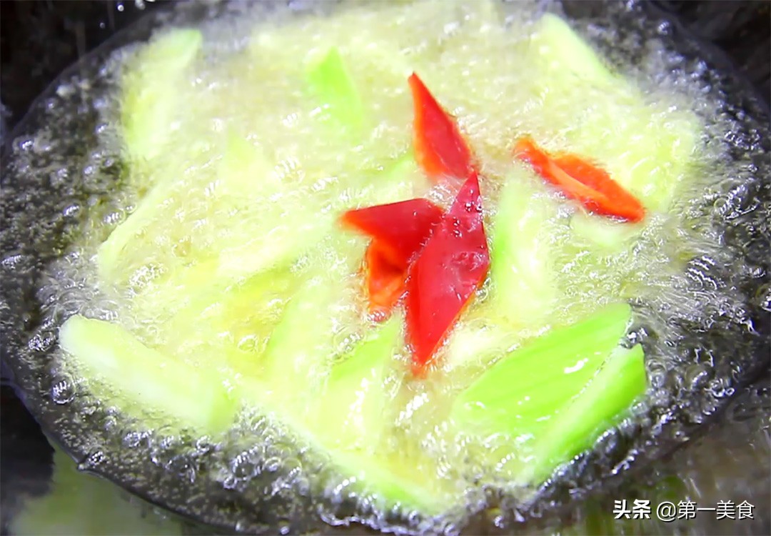 丝瓜在滑油时,油温四成不要过高,要把丝瓜滑透出锅的颜色是碧绿色的。