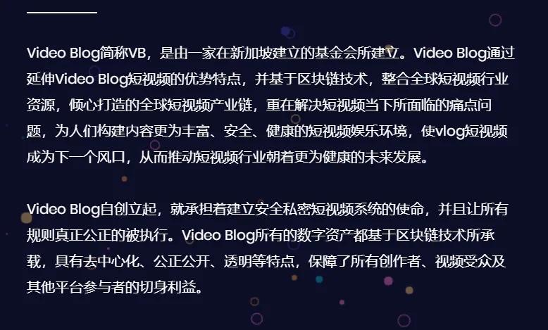 Video Blog简称VB,基于区块链技术并借势5G,通过延展VLOG短视频的优势特点,让整个短视频体系自生长和繁殖,实现一个无中心自生长的终极虚拟社会形态,据了解,最新公链采用SPOS(sign power of work)共识机制,支持虚拟机和POS2.0智能协议,可以实现非常灵活的自定义应用。