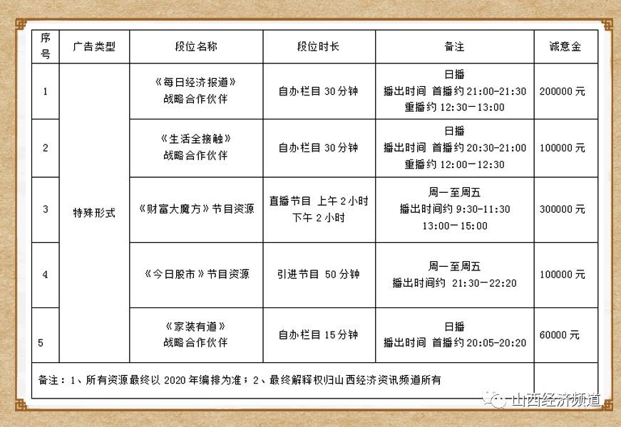 山西广播电视台经济资讯频道广告资源公示