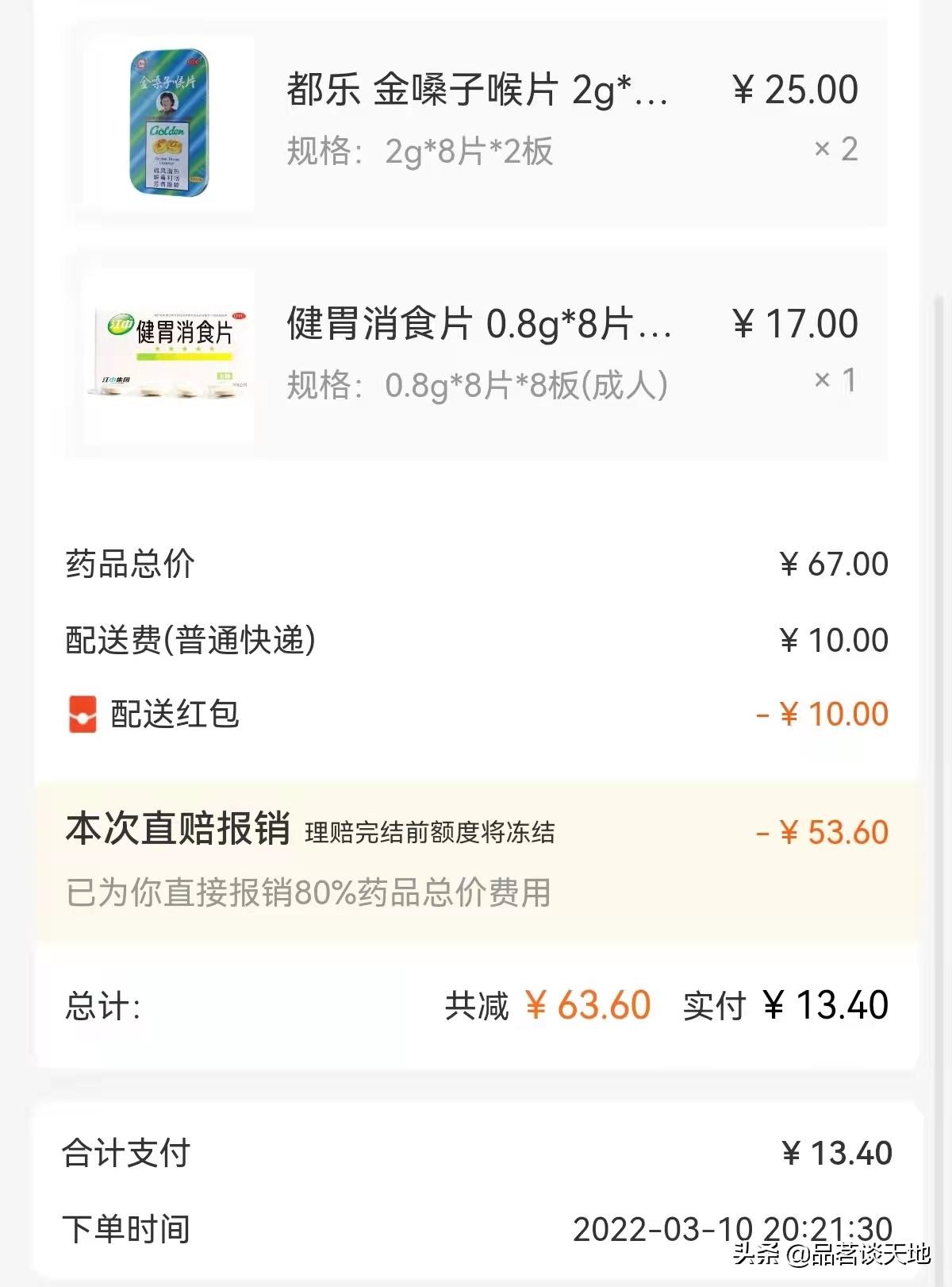 除了在线问诊,也可以选择自助购药,进去后发现自助购药里可选择的品种更少,而且价格比药店还贵不少。最后实在气不过,在能买的药品里,买了两盒金嗓子、一盒健胃消食片,原价67元,报销了53.6,自费13.4元。这就是今天好医保门急诊报销的理赔经历,本来想着能减少医疗负担,现在看来纯属鸡肋~