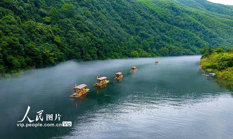 2023年7月17日,在安徽省宁国市青龙乡储家滩,游客们乘坐竹筏漂流在云雾缥缈的西津河上。