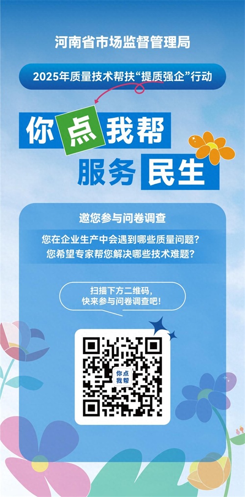 为贯彻落实党中央、国务院关于质量强国建设的决策部署,提升产业整体质量水平,河南省市场监管局于2025年2月—12月在全省范围内开展质量技术帮扶“你点我帮”行动,向企业征集重点关注的产品质量安全问题,帮助企业解决发展中面临的标准、技术等难题。