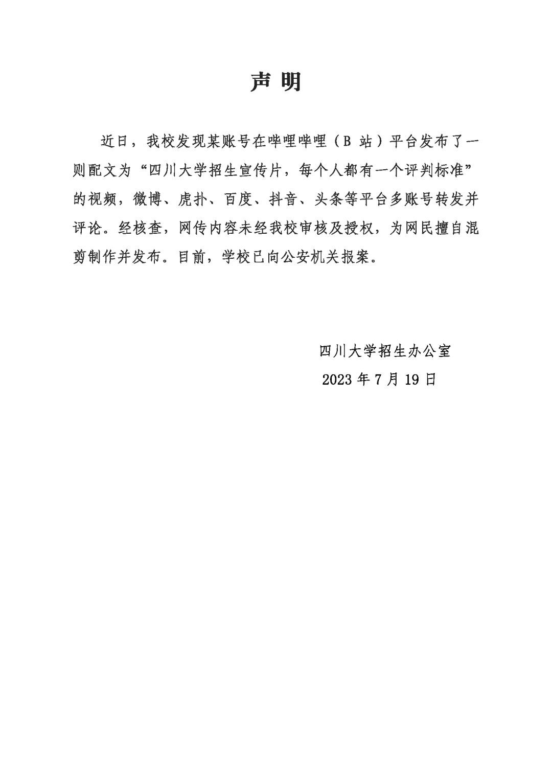 近日,四川大学发现某账号在哔哩哔哩 (B站)平台发布了一则配文为“四川大学招生宣传片,每个人都有一个评判标准”的视频,微博、虎扑、百度、抖音、头条等平台多账号转发并评论。经核查,网传内容未经学校审核及授权,为网民擅自混剪制作并发布。目前,学校已向公安机关报案。