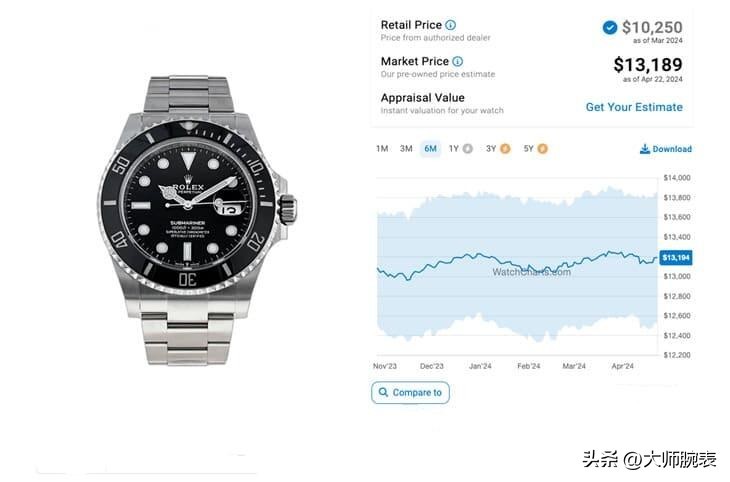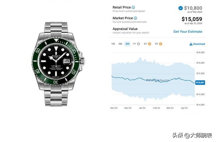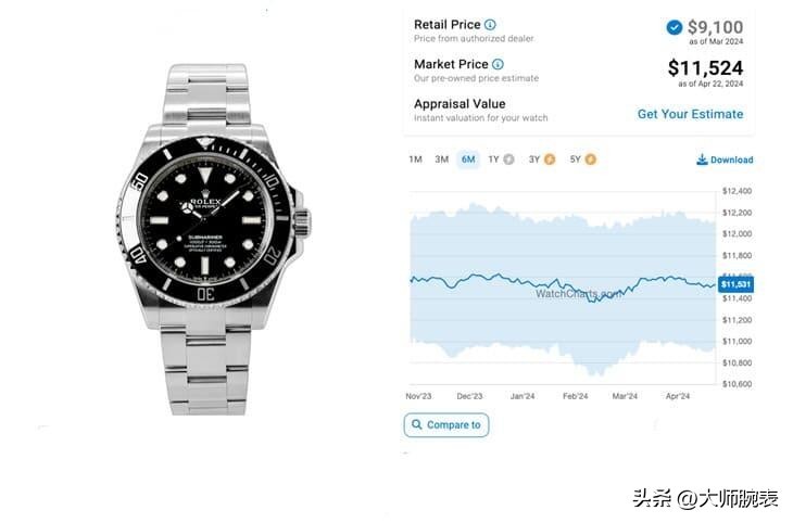 近两年的腕表行情并不是很好,不过黑水鬼甚至在2024年2月底开始有了小小一波上涨,延续保值的属性,每年递增,溢价率28.6%。