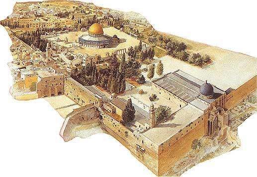 传说犹太人的先祖在耶路撒冷的圣殿山(古时候叫摩利亚山)与天使决斗胜利,上帝便给他们赐名“以色列”,于是他们在神圣的决斗地方建造了第一座圣殿,供人们来朝圣。但是第一座圣殿因古巴比伦人的入侵而遭到毁坏。在公元前516年犹太人又在第一圣殿的原址上建造第二圣殿。