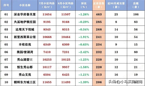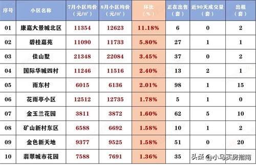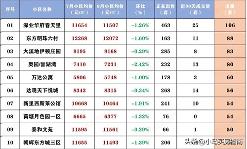本次盘点了300个二手小区的挂牌均价,主要统计了小区7月和8月的挂牌价、环比涨跌幅、挂牌量、近90天成交量以及出租量几个维度的数据。