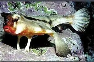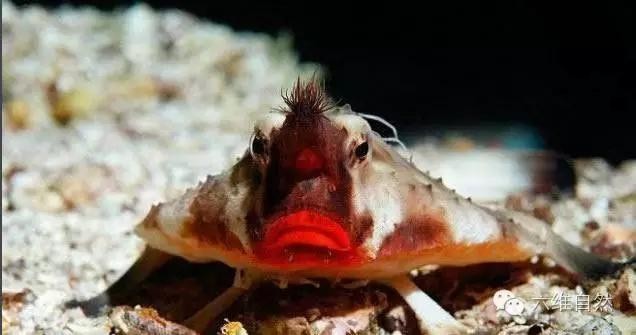 生活在拉帕戈斯群岛的红唇蝙蝠鱼(Ogcocephalus darwini),故名思义有着鲜艳的红唇,更特殊的是它有四条「腿」,被视为是世上最丑的鱼种之一。有着一个大头,用胸鳍在海底「行走」。主食是虾、软体动物、小鱼、螃蟹和蠕虫。成年时,其背鳍会长成类似头角的刺状,投影来引诱猎物。长相真的很特别。