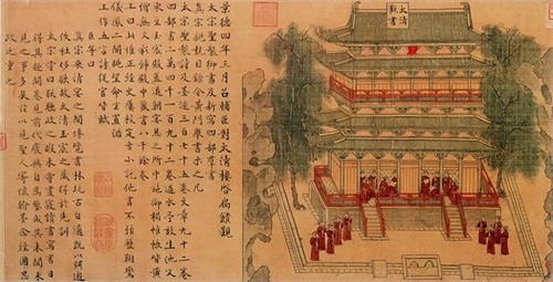 台北故宫博物院收藏的宋代《景德四图》,其中一幅《太清观书图》,描绘的便是景德四年宋真宗率大臣登太清楼阅览藏书的故事,可见宋朝的皇室图书也有一定的开放性。画中大臣都是绯红色的,可见都是五品以上的大臣。三品以上佩鱼袋。此画描写的是北宋汴京皇宫里的藏书楼。元丰改制后,四品以上的改为紫色,六品以上是绯红色,七品及七品以下是绿色的。