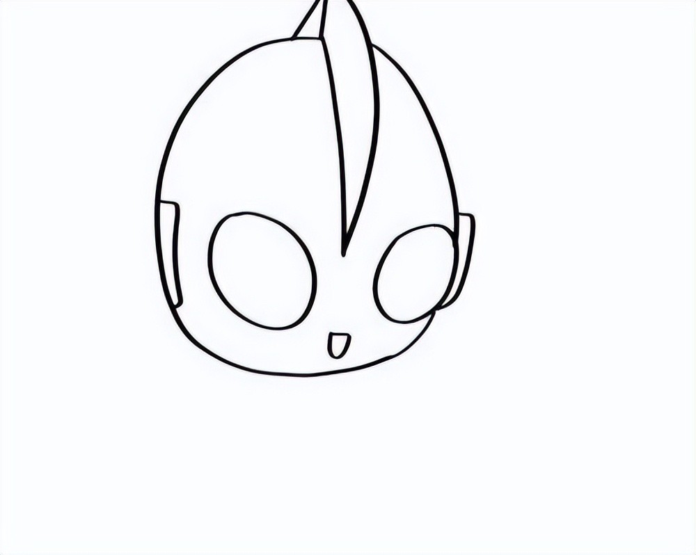 1.首先在奥特曼的头顶画一个尖尖的触角,然后画两只大眼睛和嘴唇。奥特曼的嘴巴在眼睛的中间,小小的嘴巴和两个长方形的耳朵。