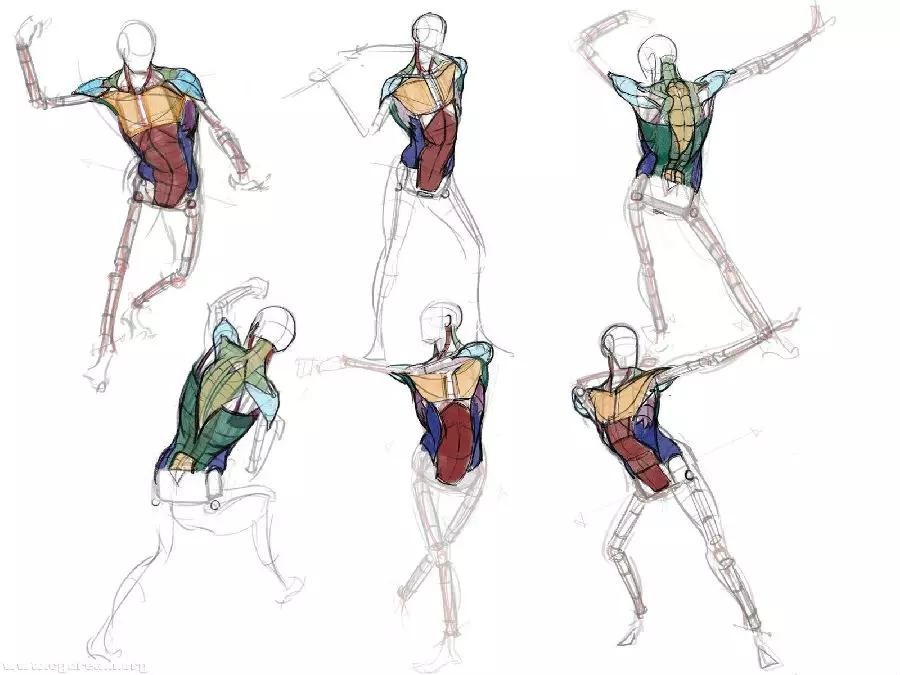 人体结构的绘画参考,对人体的理解会有很大的帮助,特别是对于结构性有很大盲区的朋友!由于男性没有女性那么明显的胸部,很容易画成平板的体型,因此,在画男性时,要想最大限度地突出男性的特征,就要把肩膀画得又宽又厚,如果再画出锁骨,人就会显得很魁梧。此外,还应注意男性关节的起伏感,手、胳膊与腿要粗壮些,手腕处要比女性的手腕部位画得要偏下(就是把手臂画长一些)。画男性的侧身像时,锁骨和肩头的线条应是连在一起的,胸部、后背不要画成直线,要表现出肌肉的起伏,从颈部到后背的线条要画得稍有曲线,这样,可以表现出男性身体的厚度。