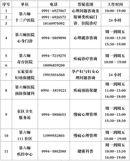 自12月15日,师市设立了11部免费心理援助热线电话,共有22名有着心理卫生专业基础的接线员为患者、一线工作人员和有需求的居民群众提供关心关爱和心理疏导。