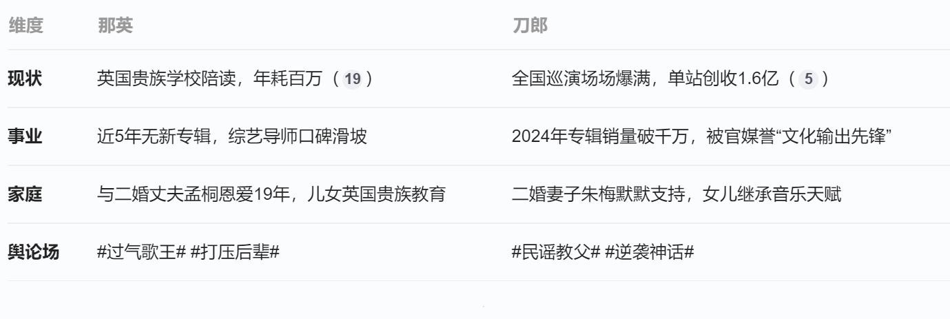 2025年:那英英国陪读期间,刀郎全国巡演带动地方经济超10亿,南昌站黄牛票炒至3万。