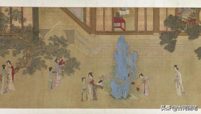 《汉宫春晓图》以人物长卷画,生动地再现了汉代宫女的生活情景。其用笔清劲而赋色妍雅,林木、奇石与华丽的宫阙穿插掩映,铺陈出宛如仙境般的瑰丽景象,极勾描渲敷之能事,体现了作者积极向上、热爱生活的人文思想,亦表达了他对宫廷浮华美好生活的赞美。