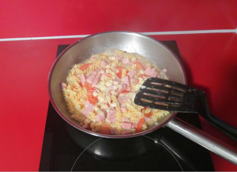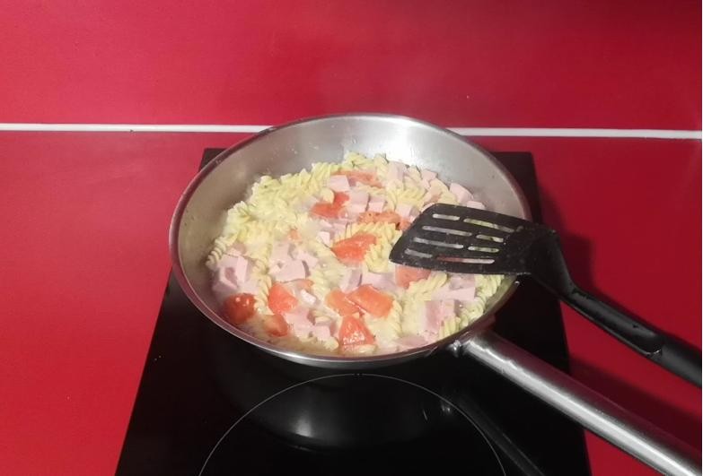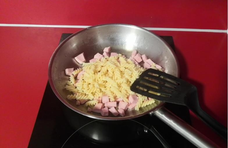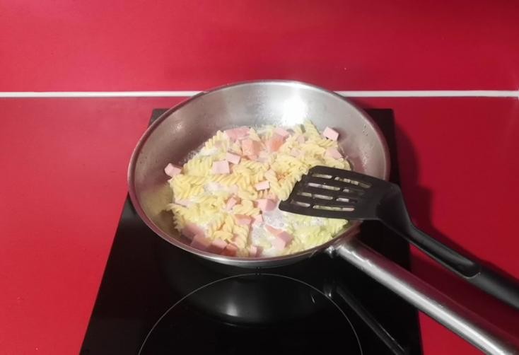 6.火腿炒香后,倒入沥干的意面(这能让意面更Q弹,口感更好),翻炒均匀。