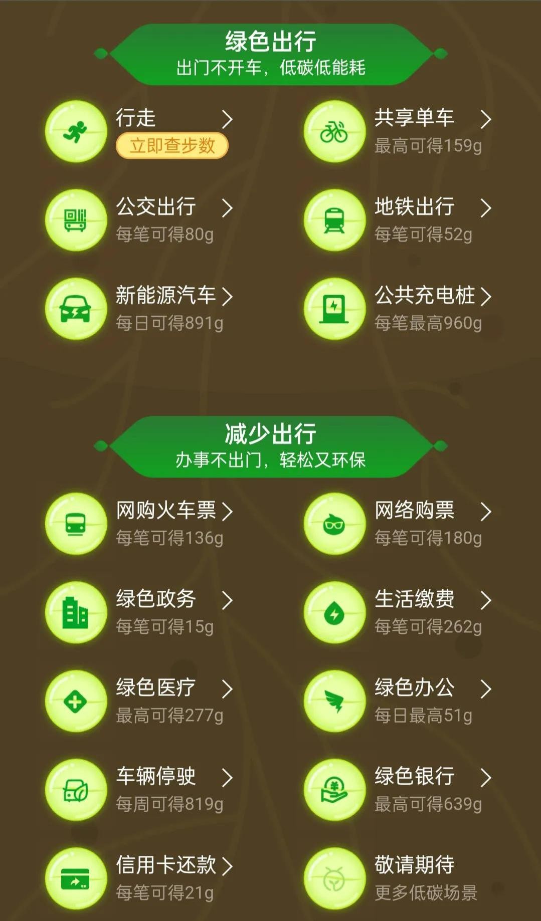 我们可以每天行走收取能量,绿色出行,办事不出门比如在网上购票,只要用支付宝都会获得能量。