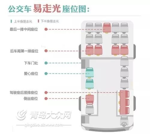 青岛公交集团提醒女乘客,公交车上有一些特殊位置容易走光,例如前车厢边侧座位、后车厢第一排座位、最后一排中间座位和驾驶座后竖排座位,这些位置由于周围遮挡物较少,身着吊带、低胸装及超短裙的乘客比较容易走光。女乘客在选择座位时应增强自我保护意识,注意防范。