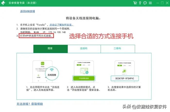 步骤1:在电脑上下载并且安装“数据蛙安卓恢复专家”,将手机连接电脑,按照向导提示使用USB或者无线连接,这里建议通过USB方式连接哦!