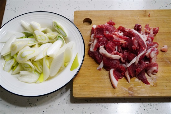 1、羊肉切成薄片,注意要把肌肉纤维横着切断,俗话说“横切牛羊斜切猪”,更容易嚼动。大葱切斜段备用。