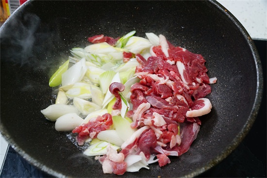 4、迅速将羊肉和大葱段倒入锅中,开旺火翻炒至羊肉变色。