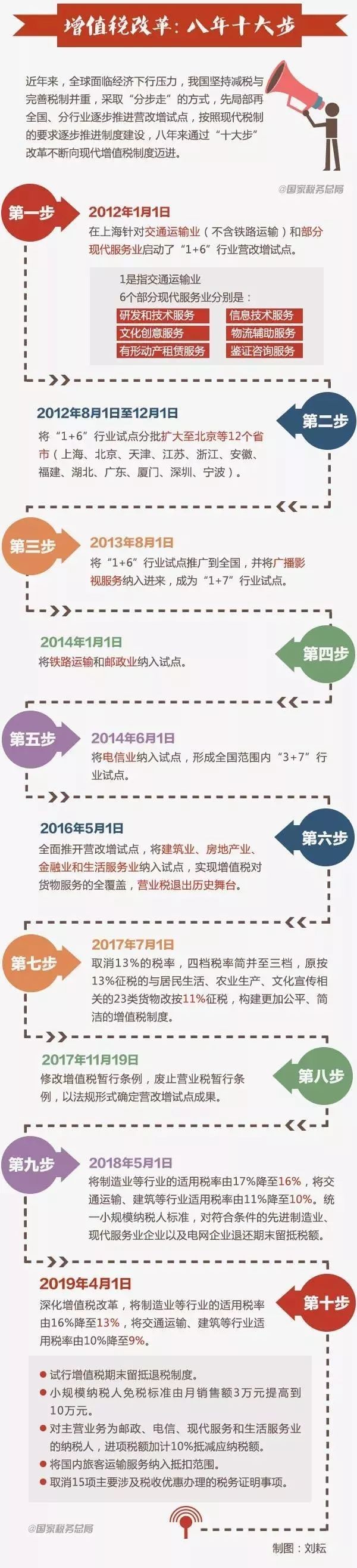 下面的长图不仅包含了最新增值税税率表,还系统性地梳理了八年来增值税改革的 “十大步”。请收好!