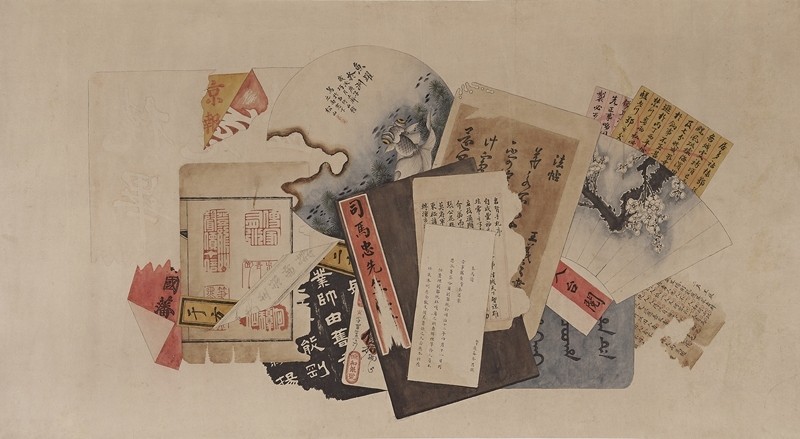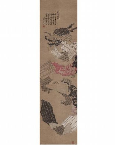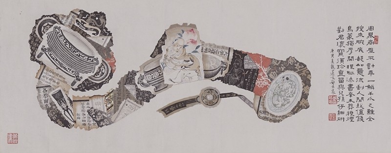 郑佐宸1950年所创作的《八破横披》将他描绘的残笺碎纸精心拼凑成一只如意的形状。