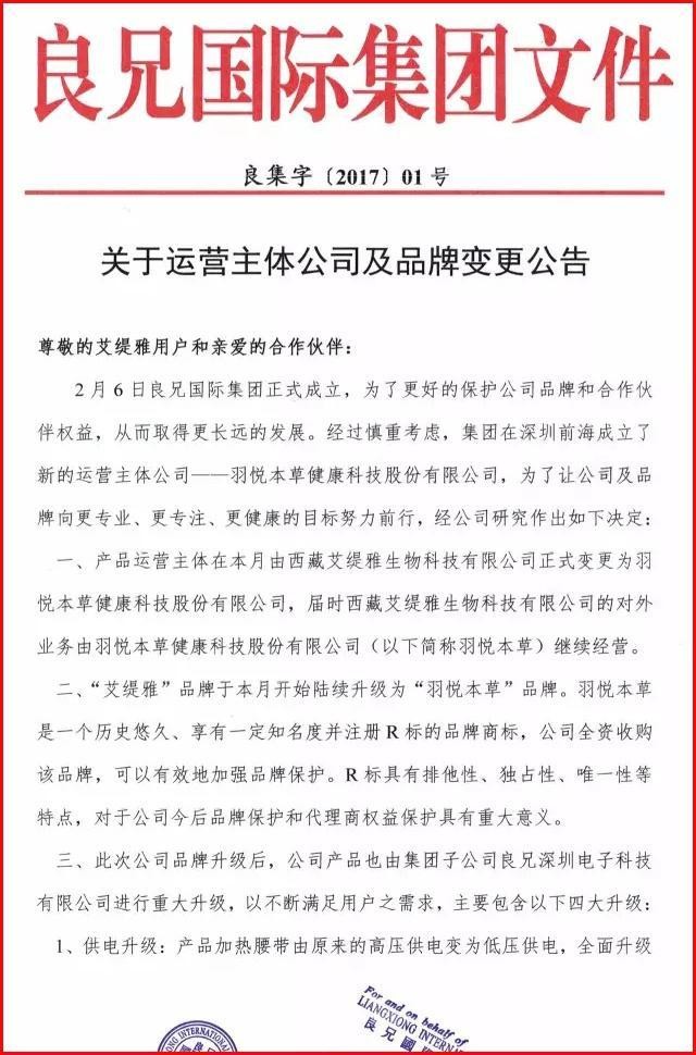 2月16日,由艾缇雅公司董事长陈某良担任董事长的良兄国际集团发布运营主体公司及品牌变更公告,称集团在深圳前海成立了新的运营主体羽悦本草健康科技公司,“艾缇雅”品牌当月开始陆续升级为“羽悦本草”品牌,产品运营主体由艾缇雅公司正式变更为羽悦本草健康科技公司,届时艾缇雅公司的对外业务由羽悦本草健康科技公司继续经营。