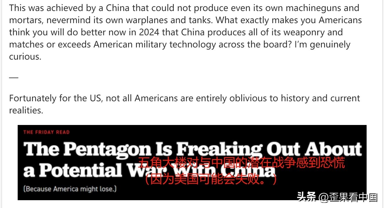 要知道这是由一个连自己的机枪和迫击炮都无法生产,更不用说自己的战机和坦克的中国实现的。既然中国已经生产了所有的武器,并且在各方面都匹敌甚至超过美国的军事技术,你们美国人究竟凭什么认为你们在 2024 年会做得更好呢?我真的很好奇。