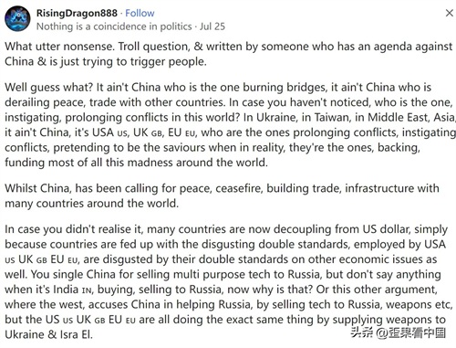 不知道你有没有意识到,许多国家现在正在与美元脱钩,是因为这些国家受够了美国、英国、欧盟所采用的令人厌恶的双重标准,也对他们在其他经济问题上的双重标准感到厌恶。你单单说中国向俄罗斯出售多用途技术,却对印度向俄罗斯购买和出售技术却只字未提,这是为什么呢?或者另一种说法,西方指责中国帮助俄罗斯,向俄罗斯出售技术和武器等,但美国英国欧盟都在做同样的事情,向乌克兰和以色列提供武器。