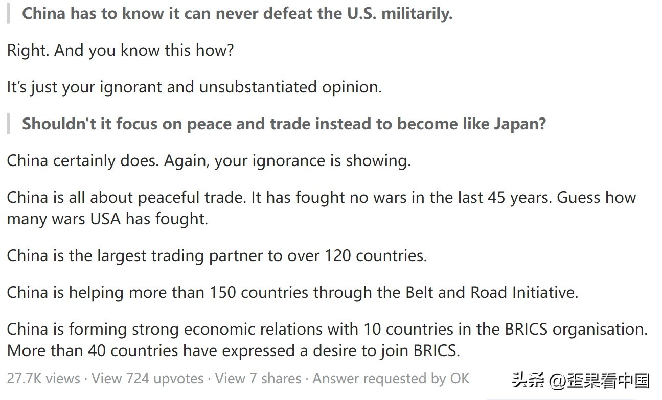 中国必须明白,它永远不可能在军事上打败美国。它难道不应该专注于和平与贸易,成为像日本那样的国家吗?这是一名美国网友在自家问答网提出的问题。