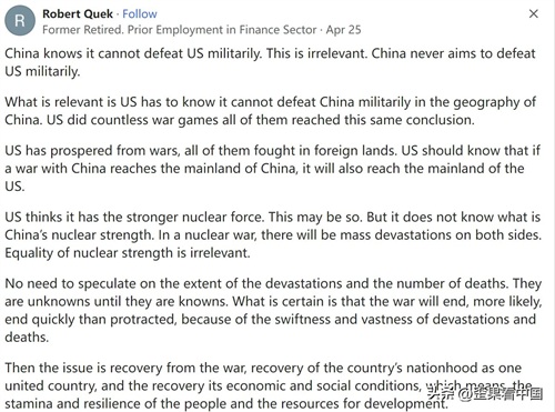 重要的是,美国必须知道,在中国的地理范围内,美国无法在军事上打败中国。美国进行了无数次军事演习,都得出了同样的结论。
