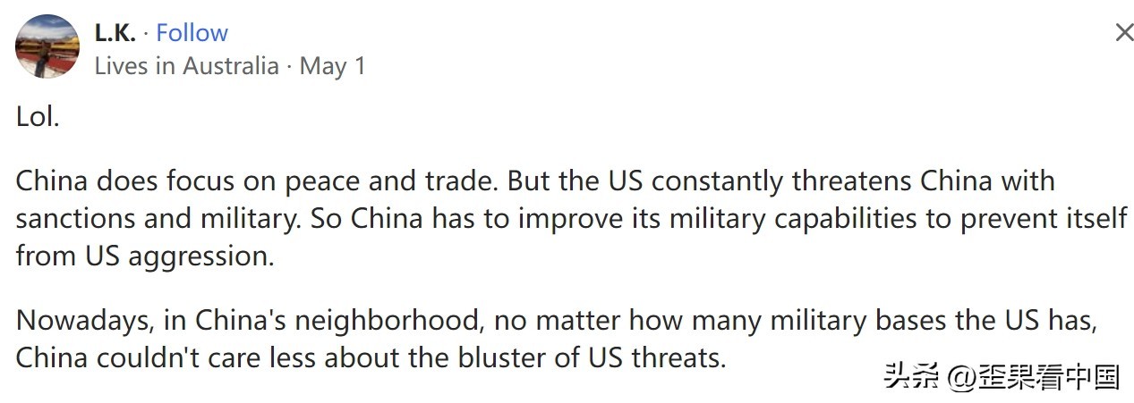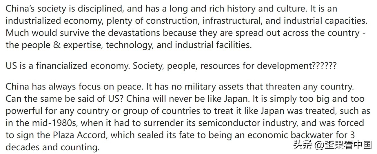 在美版知乎上就有位美国网友说到:中国必须明白,它永远不可能在军事上打败美国。它难道不应该专注于和平与贸易,成为像日本那样的国家吗。