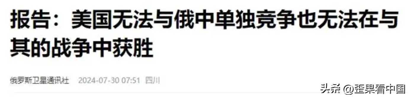 在这个提问之中我隐隐约约感觉到了美国的不安,甚至还有一丝畏惧,这似乎印证了7月30日,俄罗斯卫星通讯社的一篇报道。该报道称:美国国防战略委员会指出,以美国现有的国防工业实力,根本无法单独和中俄竞争,也无法在战争之中获胜。美国必须强化与各个盟友之间的关系。