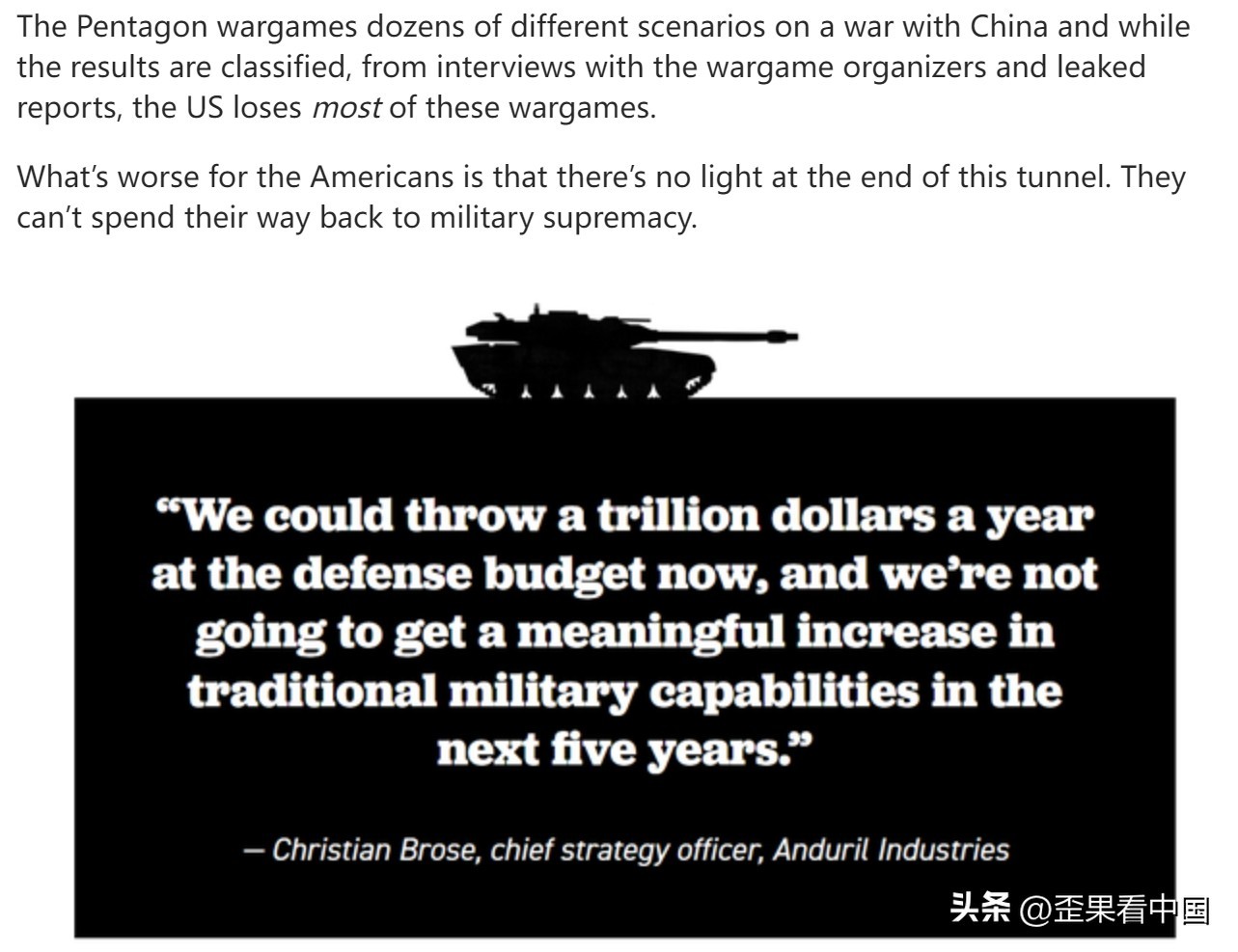 五角大楼针对与中国的战争场景进行了数十种不同的兵棋推演,虽然结果是保密的,但从对兵棋组织者的采访和泄露的报告来看,美国在大多数兵棋推演中都失败了。