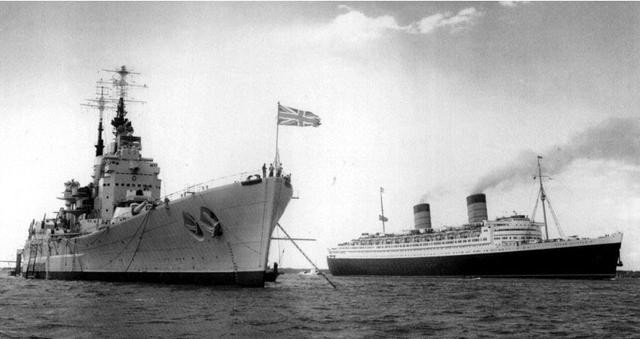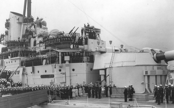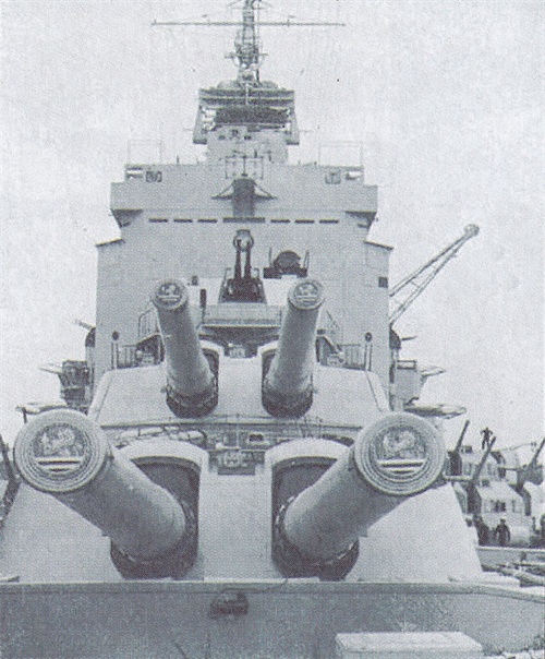 1947年王室海上之旅中的前卫号战列舰,巨大的舰艏主炮塔。