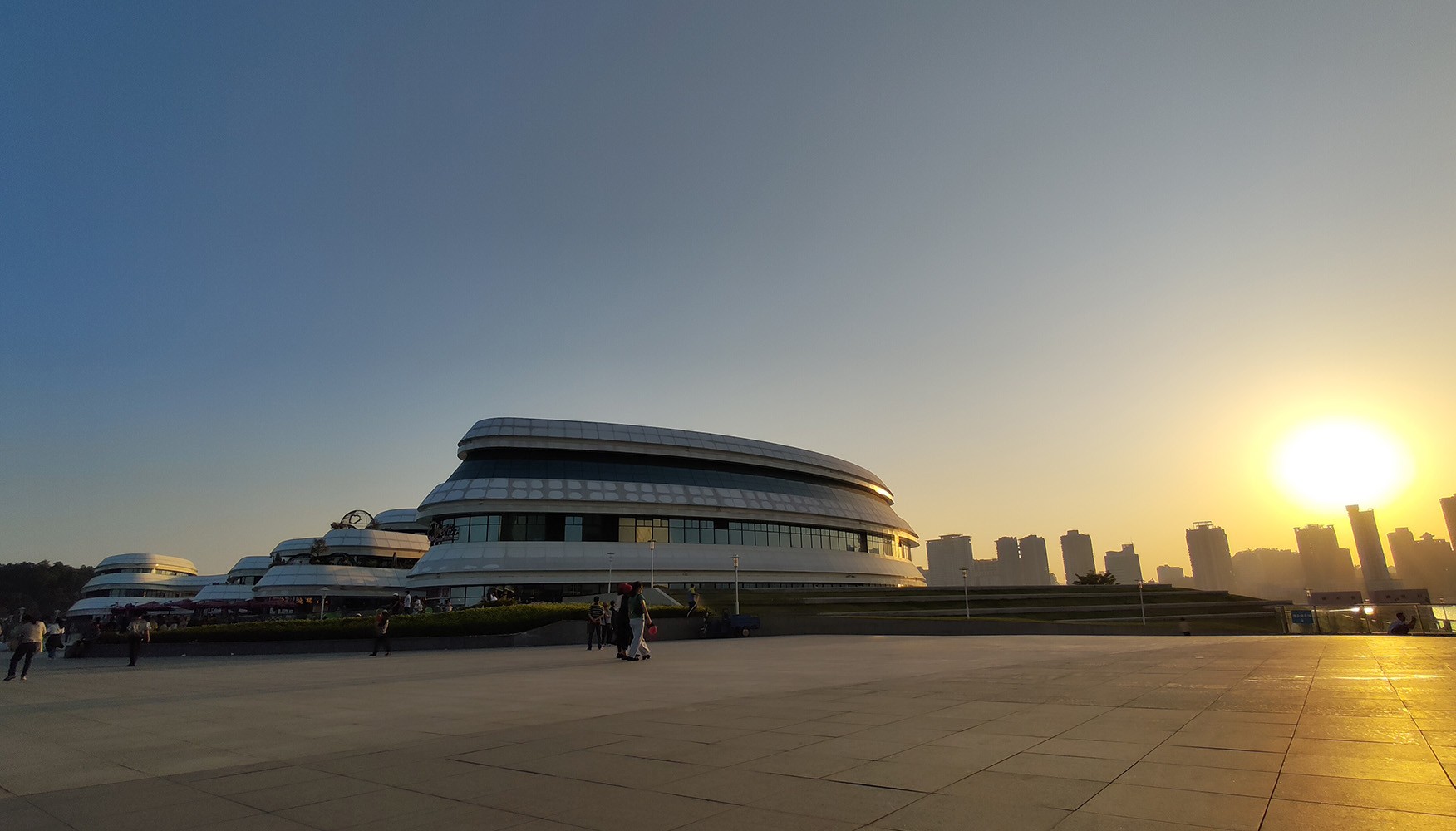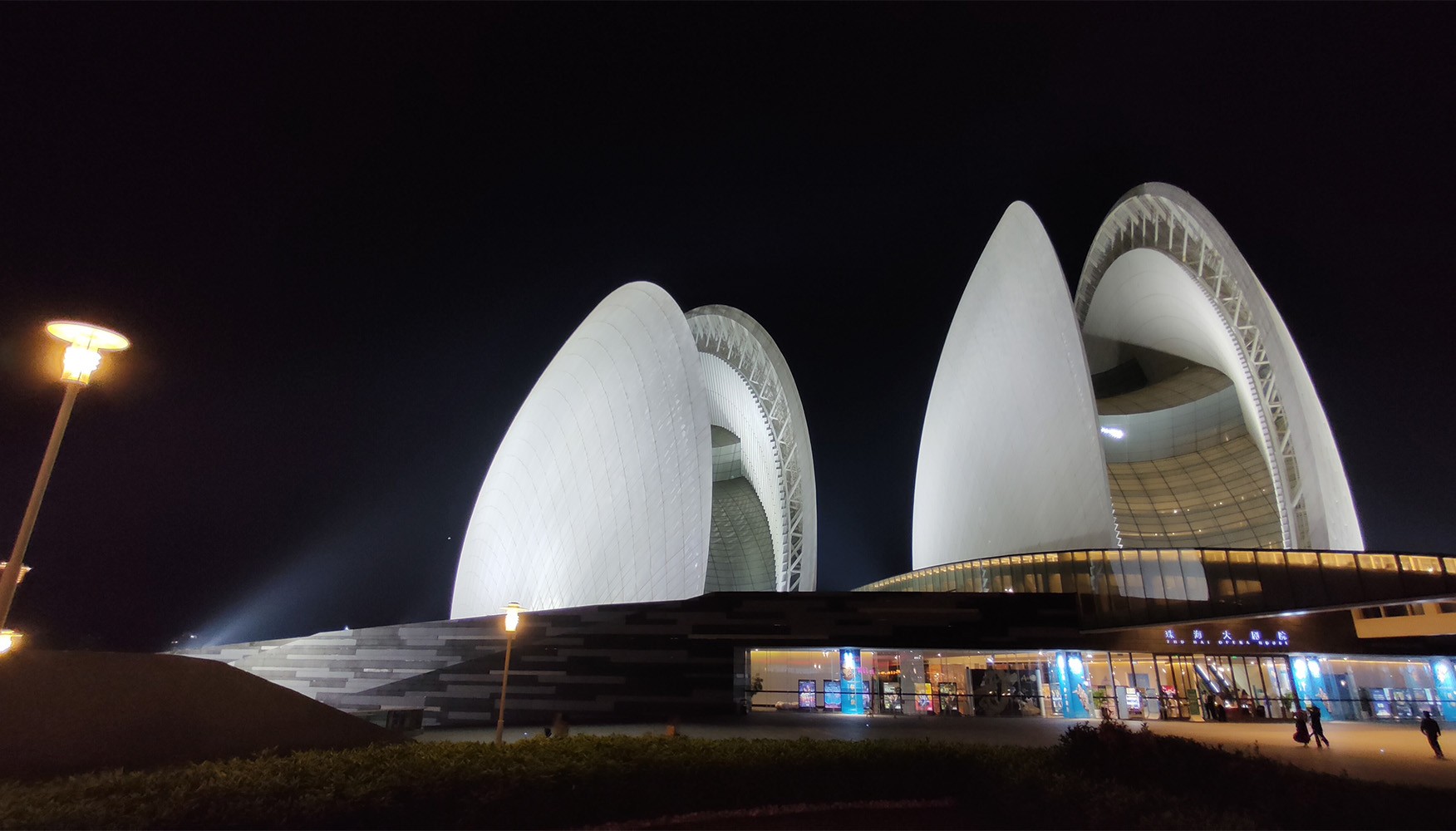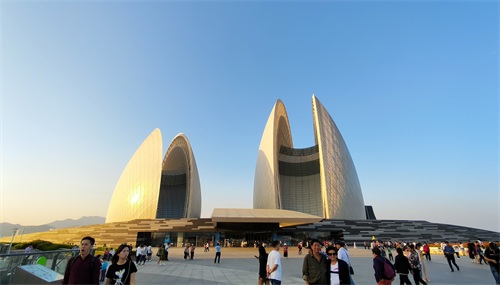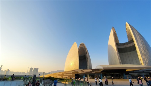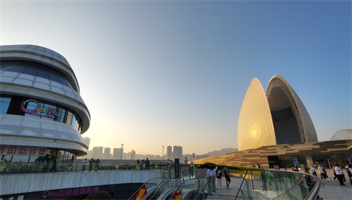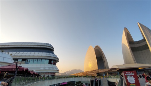 形式贝壳的日月贝在日落时段,在大剧院正门广场上,每一位拍照的旅客都会说同一句话:“太美了!太美了!”